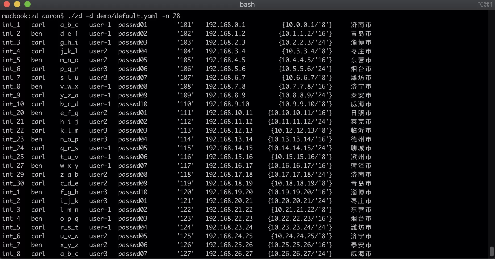 $>zd.exe -d demo\default.yaml -c demo\test.yaml -n 100 -o test.txt # 输出原始格式的数据。 $>zd.exe -d demo\default.yaml -c demo\test.yaml -n 100 -o test.json # 输出json格式的数据。 $>zd.exe -d demo\default.yaml -c demo\test.yaml -n 100 -o test.xml # 输出xml格式的数据。 $>zd.exe -d demo\default.yaml -n 100 -o test.sql -t user # 输出针对user表的insert语句。 $>zd.exe -d demo\default.yaml -n 100 -o test.sql -t user --trim # 输出针对user表的insert语句,去掉前后缀。