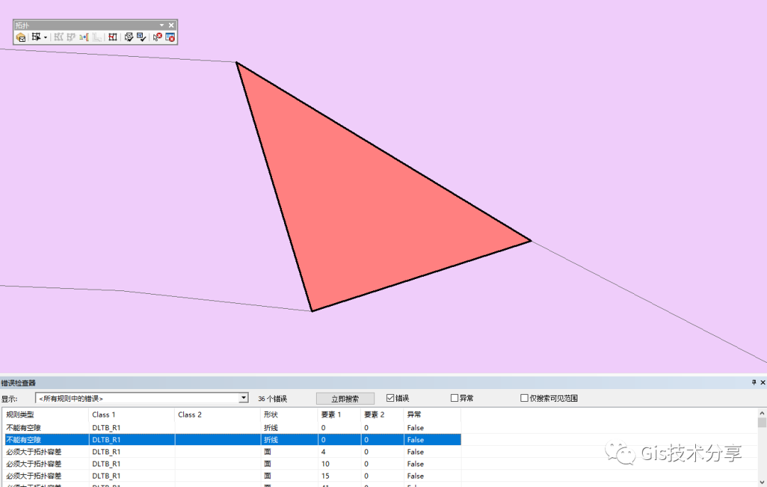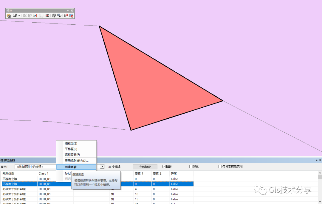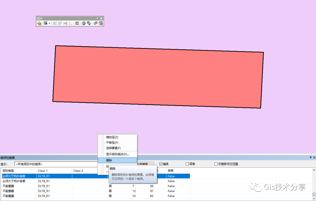 必须大于拓扑容差,这个错误拓扑规则要求要素在验证过程中不折叠。此规则是拓扑的强制规则,应用于所有的线和面要素类。在违反此规则的情况下,原始几何将保持不变,修复方式就是直接右键删除。