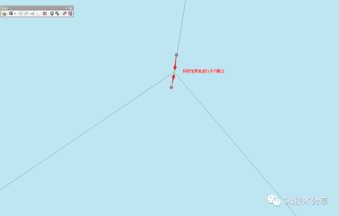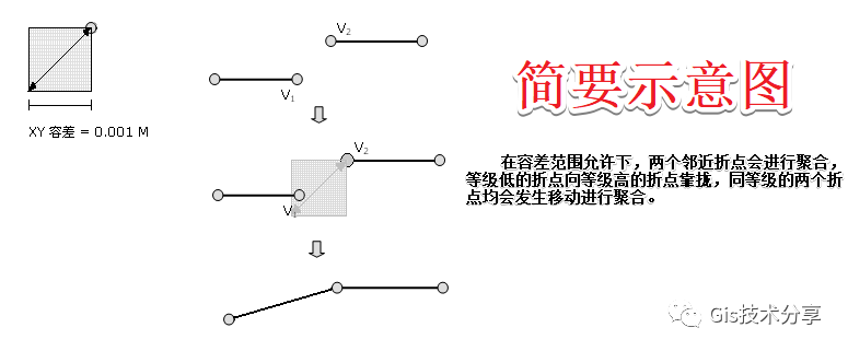 拓扑容差范围内低等级要素的折点将被捕捉到邻近的高等级要素的折点。对处于拓扑容差范围内的同级要素折点的位置将进行几何平均。