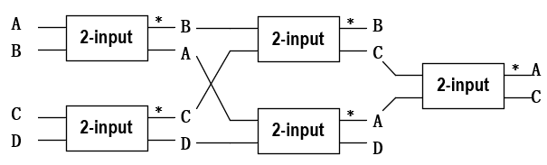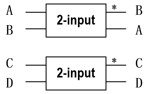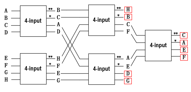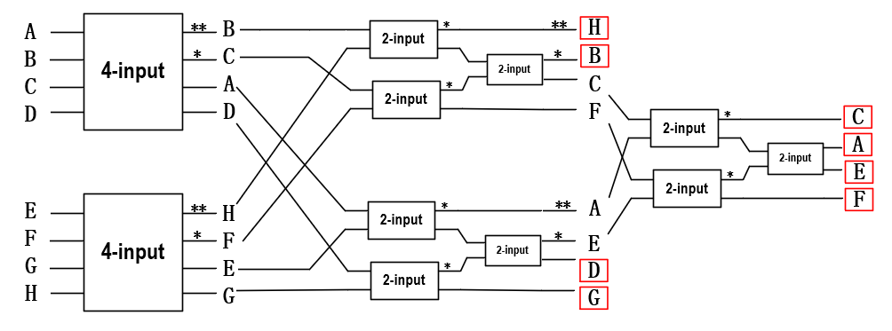 乍一看,排序算法,这不是个算法题么,将8个数排下序,脑子里最先出来的是什么冒泡,选择,插入排序......赶紧打住,我们现在在讨论电路,不要走错片场了。实际上题目限定了二输入的比较器,所以方向很明确,现在已经有二输入排序模块,我们要用这个二输入的模块搭成8输入的。那么自然也就能想到,先搭个4输入的,看有没有什么规律。现在问题简化为4输入排序,很自然就想到,先分两组,每组之间排一下:(*表示较大的输出)