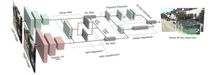 Faster R-CNN扩展为立体信号输入,以同时检测和关联左右图像中的对象。稀疏的关键点,视点和对象尺寸是通过在三维区域提议网络之后添加其他分支来预测的,该分支网络与2D左右框组合以计算3D粗略对象边界框。然后,通过使用左RoI和右RoI的基于区域的光度对齐来恢复准确的3D边界框。