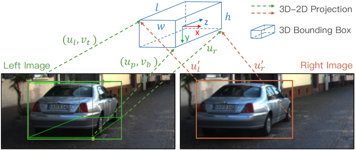 给定左右2D边界框,透视关键点和回归尺寸,可以通过最小化二维反投影的误差来获得3D边界框。