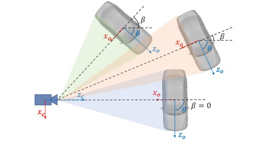 使用θ表示图像每一帧中车辆的运动方向。β表示目标相对于相机中心的方位角。图片中的三辆汽车具有不同的方向,但它们在ROI图像上的投影完全相同。