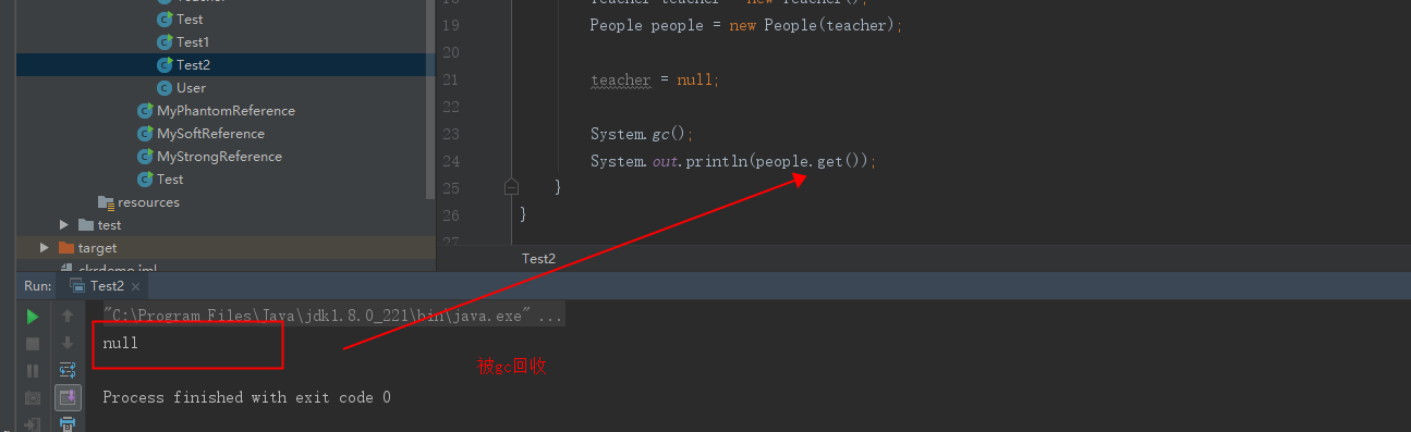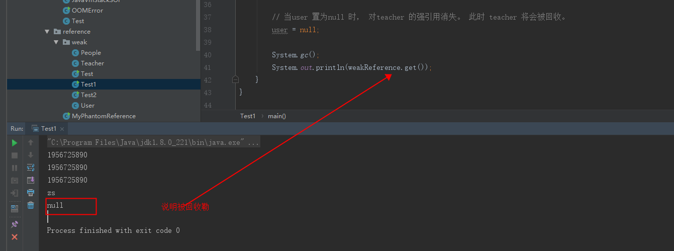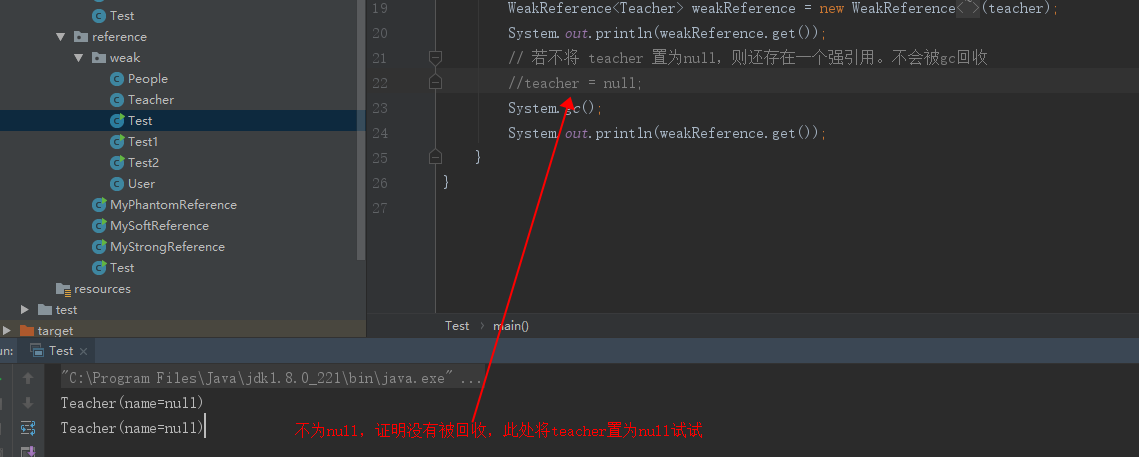 /** * User 对象持有 Teacher 对象的强引用。 * 当teacher 被置为null 时。 teacher 的强应用 随之消失。 * 而 User 对 Teacher 的强引用还在。 故 user.getTeacher() 并不是null * 所以 teacher 并不会被 gc 回收。 * * 当 user 也被置为null时。 user 对 teacher 的强引用也不存在勒。 * 此时 teacher 将会被gc回收 */ public class Test1 { public static void main(String[] args) { User user = new User(); Teacher teacher = new Teacher(); teacher.setName("zs"); user.setTeacher(teacher); WeakReference<Teacher> weakReference = new WeakReference<Teacher>(teacher); System.out.println(System.identityHashCode(weakReference.get())); System.out.println(System.identityHashCode(teacher)); System.out.println(System.identityHashCode(user.getTeacher())); teacher = null; System.out.println(user.getTeacher().getName()); // 当user 置为null 时, 对teacher 的强引用消失。 此时 teacher 将会被回收。 user = null; System.gc(); System.out.println(weakReference.get()); } }