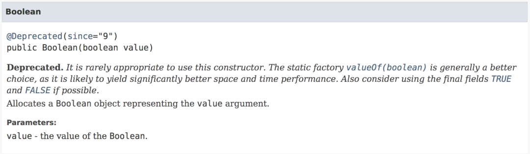 以下实例为 Java 9 中关于 Boolean 类的说明文档,文档中 @Deprecated 注解使用了 since 属性:Boolean Class。