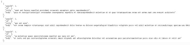 访问http://jsonplaceholder.typicode.com/posts 可以获得JSON数组方式的请求结果如图(一共100条我截图截取3条记录):