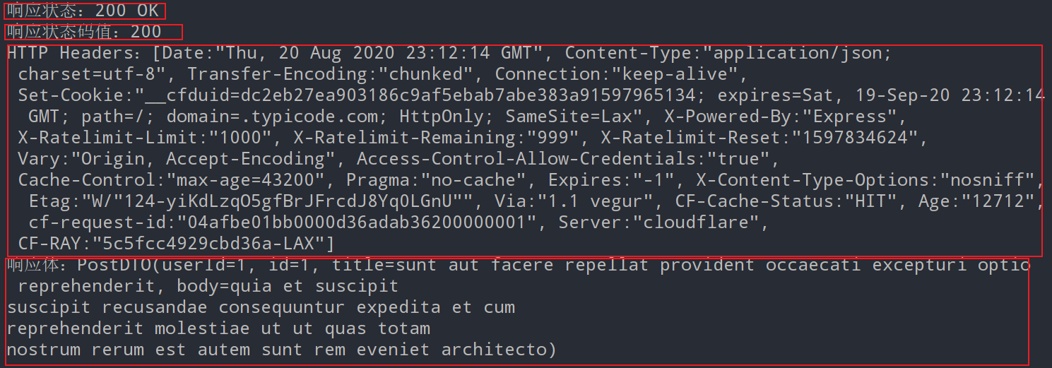 通过浏览器访问 "http://jsonplaceholder.typicode.com/posts/1" 得到JSON响应结果,和我们通过程序打印出的响应结果数据内容一致。程序控制台截图如下: