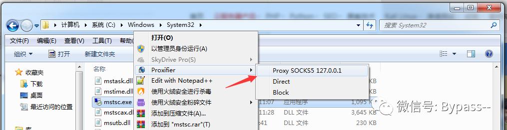 5、进入C:\Windows\System32,找到mstsc.exe,右键选择Proxifer—Proxy SOCKS 127.0.0.1。