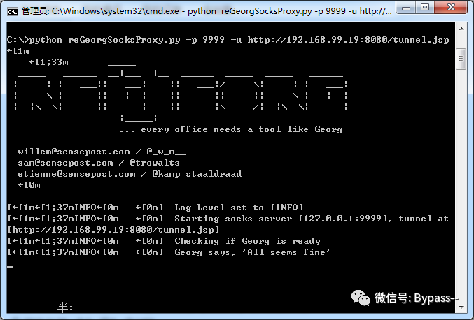 2、在攻击者机器上,启动reGeorgSocksProxy.py,监听9999端口,看到 Checking if Georg is ready,确认正常运行。