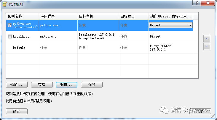 4、设置代理规则,应用程序选择python,目标主机和目标端口都任意,动作选Direct。