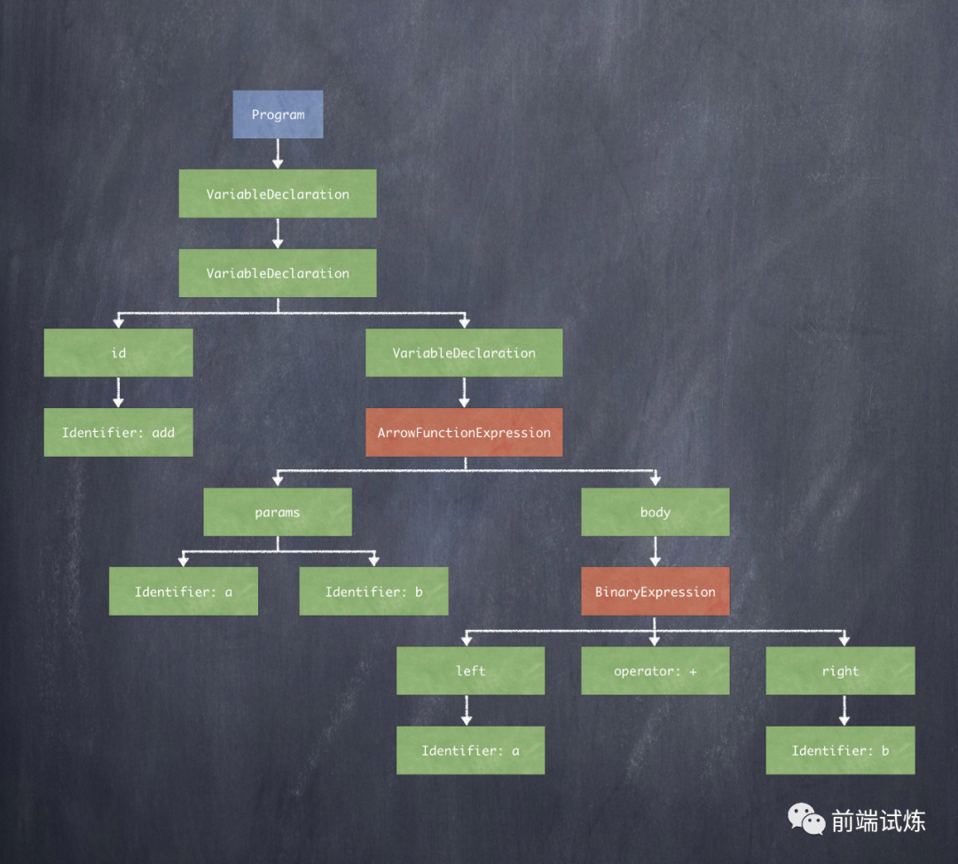 我们还是拿上面的🌰来说明 const add = (a, b) => a + b;,这样一句简单的代码,我们来看看它生成的 AST 会是怎样的: