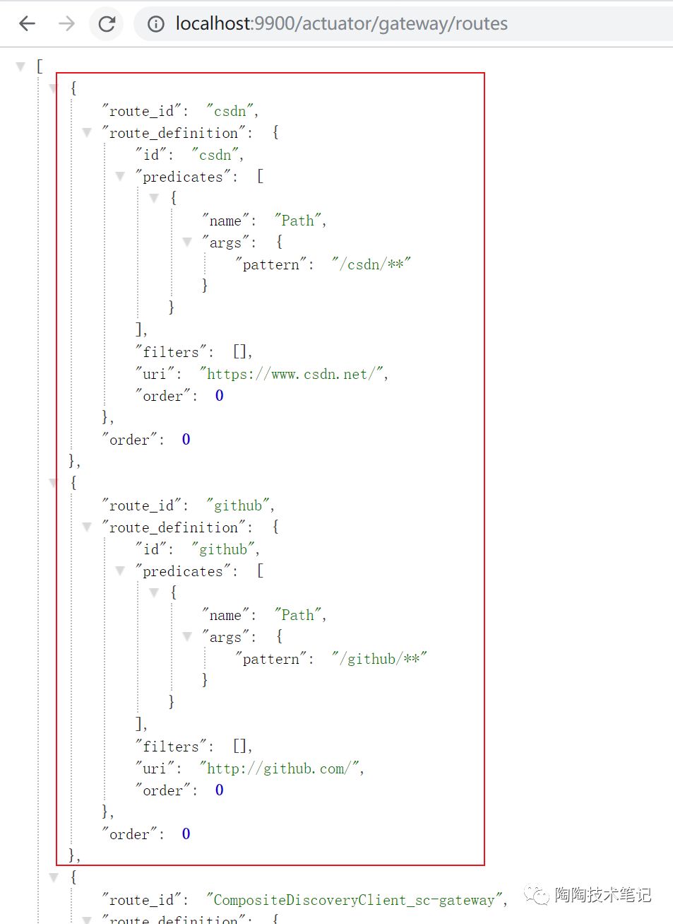 [ { "id": "csdn", "predicates": [{ "name": "Path", "args": { "pattern": "/csdn/**" } }], "uri": "https://www.csdn.net/", "filters": [] }, { "id": "github", "predicates": [{ "name": "Path", "args": { "pattern": "/github/**" } }], "uri": "http://github.com/", "filters": [] } ]添加两条路由数据