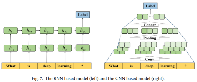 浅层学习模型:浅层学习模型加快了文本分类速度,提高了准确性,并扩大了浅层学习的应用范围。首先是对原始输入文本进行预处理,以训练浅层学习模型,该模型通常包括分词,数据清理和数据统计。然后,文本表示旨在以对计算机来说更容易的形式来表达预处理的文本,并最大程度地减少信息丢失,例如词袋(BOW),N-gram,术语频率倒排文档频率(TF-IDF),word2vec [94]和GloVe [95]。BOW的核心是用字典大小的向量表示每个文本。向量的单个值表示对应于其在文本中固有位置的词频。与BOW相比,N-gram考虑相邻单词的信息,并通过考虑相邻单词来构建字典。TF-IDF使用单词频率并反转文档频率来对文本建模。word2vec使用本地上下文信息来获取单词向量。GloVe -具有局部上下文和全局统计功能-训练单词-单词共现矩阵中的非零元素。最后,根据所选特征将表示的文本输入分类器。