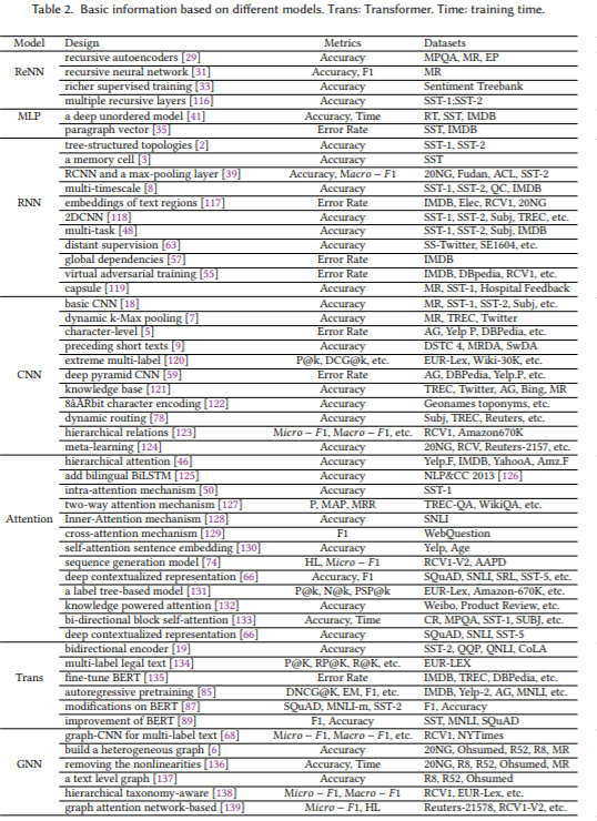 •在表1中介绍了文本分类的过程和发展,并根据出版年份总结了经典模型的必要信息,包括场所,应用程序,引文和代码链接。