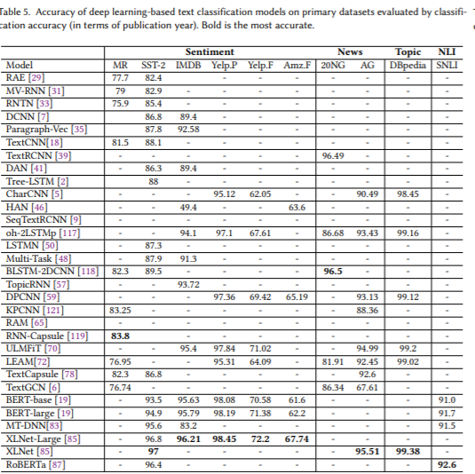 •在表5中总结了经典模型在基准数据集上的分类准确度得分,并通过讨论文本分类面临的主要挑战。