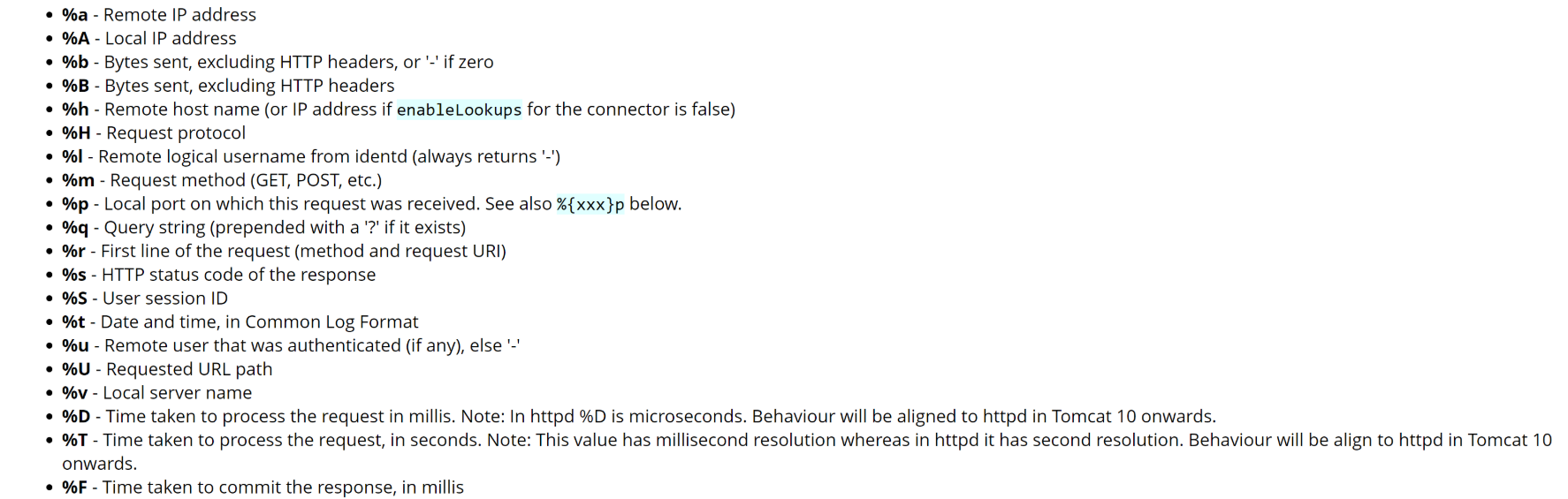 pattern="%h %l %u %t "%r" %s %b %D %F" />
