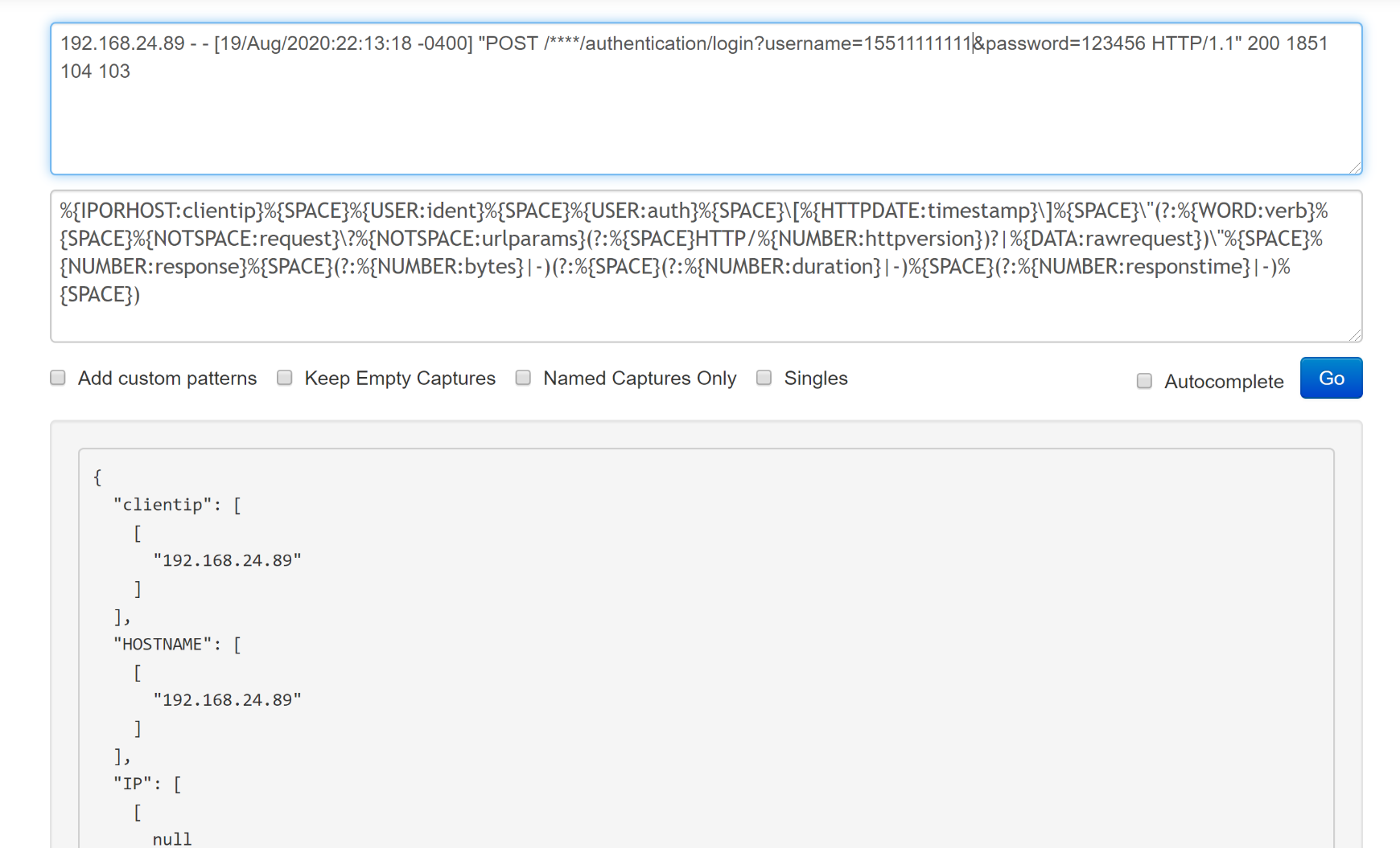 match => { "message" => "%{IPORHOST:clientip}%{SPACE}%{USER:ident}%{SPACE}%{USER:auth}%{SPACE}\[%{HTTPDATE:timestamp}\]%{SPACE}\"(?:%{WORD:verb}%{SPACE}%{NOTSPACE:request}\?%{NOTSPACE:urlparams}(?:%{SPACE}HTTP/%{NUMBER:httpversion})?|%{DATA:rawrequest})\"%{SPACE}%{NUMBER:response}%{SPACE}(?:%{NUMBER:bytes}|-)(?:%{SPACE}(?:%{NUMBER:duration}|-)%{SPACE}(?:%{NUMBER:responstime}|-)%{SPACE})" }