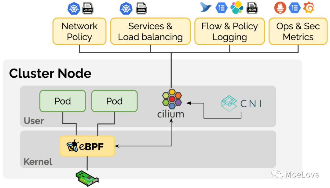 Cilium 的出现恰恰满足了这些需求,它基于 eBPF 技术的实现,使 Linux 内核具备了 Kubernetes 的意识。它可以很好的满足现在新的对容器负载的可伸缩性,可观察性以及安全等方面相关的要求。此外, Cilium 所提供的功能也远超了传统 CNI 提供的功能,不仅有传统的 Network Policy, service 和 LB ,还有 Flow & Policy logging 以及内置运维和安全侧的 metrics 等。