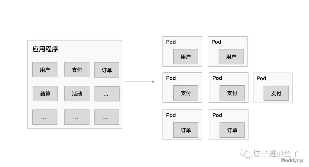像在云原生中,常见于在 Kubernetes 将一个业务服务作为一个 Service 部署发布,再根据实际的资源和调度情况进行 Pod 的扩缩容就可以了,资源也不会有直接干扰,且外部/内部调用都是有统一的入口管理。