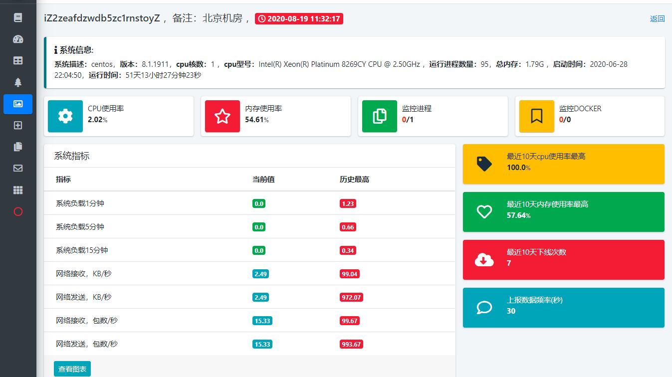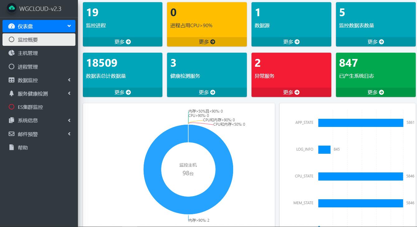 WGCLOUD,server端基于springboot开发,agent端使用go编写。支持高并发高性能,核心模块包括:服务器集群监控,ES集群状态监控,CPU监控,内存监控,数据监控,docker监控,网络流量监控,服务心跳检测,应用进程管理,磁盘IO监控,系统负载监控,监控告警信息推送。