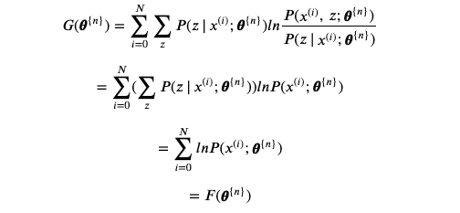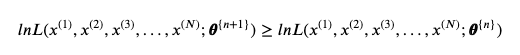 大概原理如下,我们首先给 赋初始值 ,然后在此基础上,找到一个可以使得对数似然函数变大的 ,然后再在此基础上找到一个能够使对数似然函数变得更大的 ,如此便可不断地提高对数似然函数的值。迭代执行n干次后,如果 和 的差值足够小,那么我们认为就找到了比较合适的 作为 的估计值。