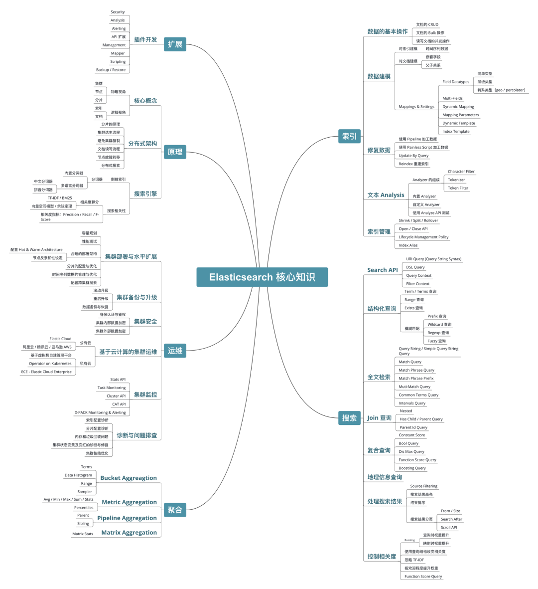 这张图出自阮一鸣,他在极客时间的视频课非常系统的讲解了整个知识体系,广受好评,阮一鸣使用的最新的 Elasticsearch 7.x,内容涵盖开发,到运维,甚至覆盖了 Elastic认证的全部考点,是非常好的教材,推荐给大家
