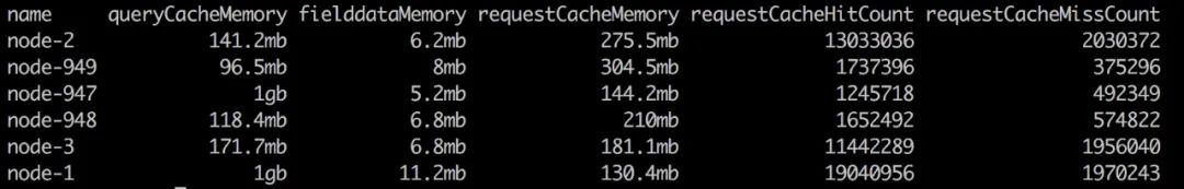GET /_cat/nodes?v&h=name,queryCacheMemory,fielddataMemory,requestCacheMemory,requestCacheHitCount,requestCacheMissCount