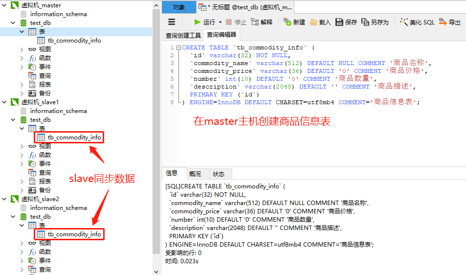 接着我们可以看到两台slave从机同步也创建了商品信息表: