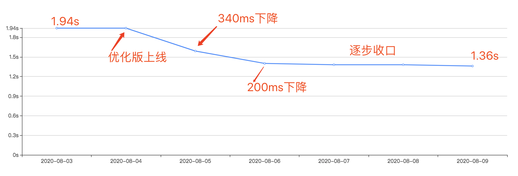 该优化版于2020年8月4日上午11点左右全量上线,在手百中逐步放量。 FMP 指标在8月5日和6日两天快速下降,7日逐步稳定。总计优化 FMP 指标 540ms 。