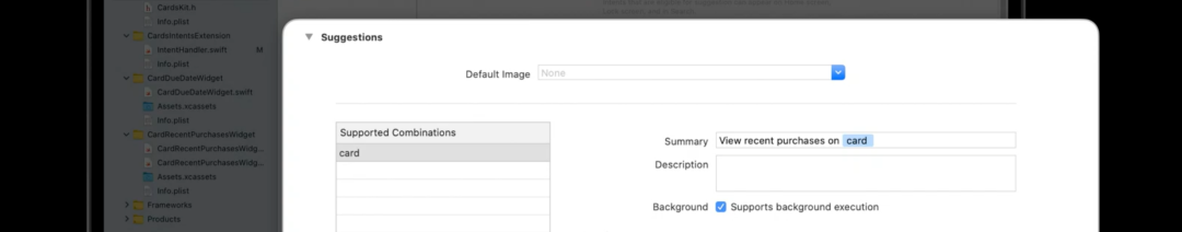 在 Suggestions 部分添加 Supported Combinations,我们只关注用户所查看的信用卡账户,所以添加一个只有 card参数的 combination。 -