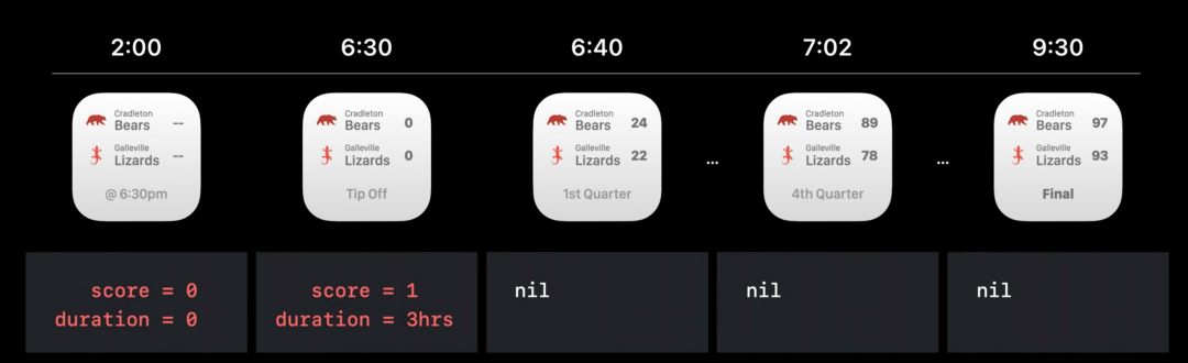例如,下图所示体育比赛信息挂件中,在 6:30 指定了一个长达三小时的相关性信息,由于后续(6:40、7:02、9:30)的 TimelineEntry 并没有提供新的 relevance 信息,那么后续的挂件展示依然会继承之前所指定的相关性数据。
