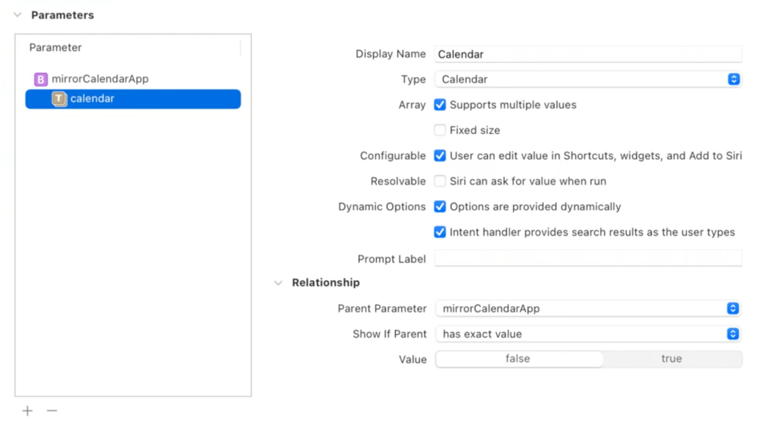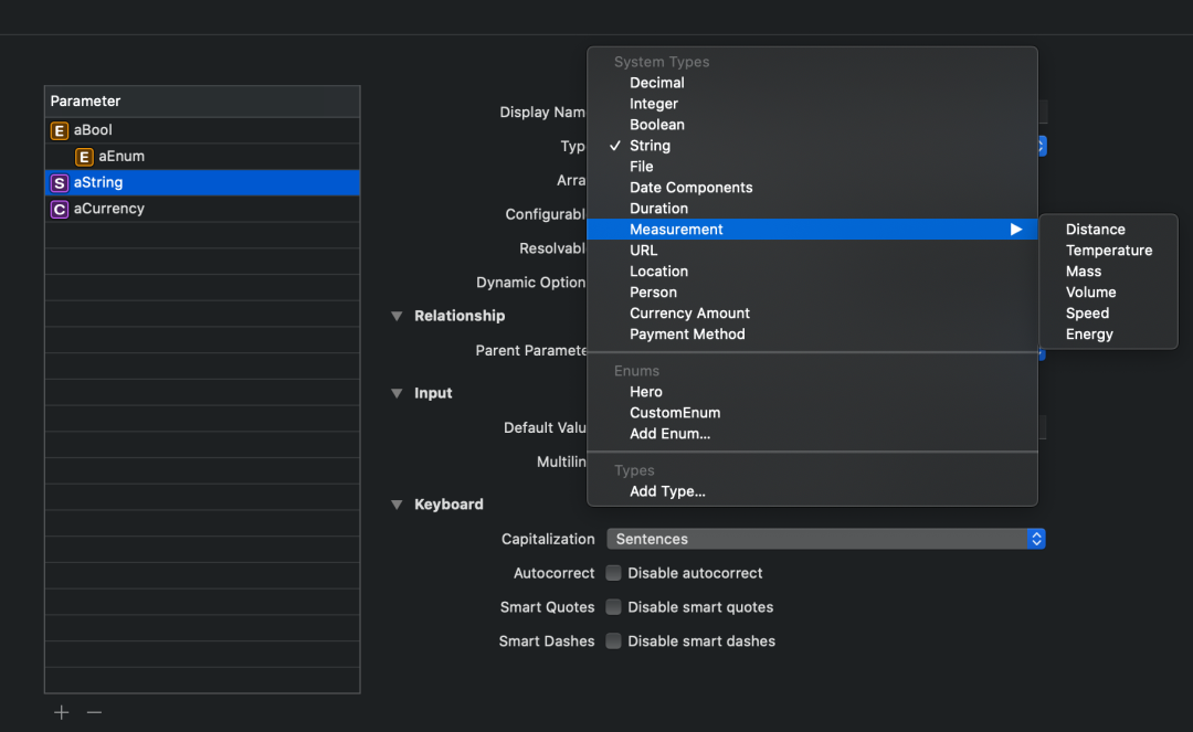 除了系统自带的参数类型以外,也支持自定义参数类型。可以通过 Add Type... 添加自定义的参数类型,通过Add Enum... 添加自定义的枚举类型,Xcode 会自动生成/更新对应的 Swift 类型(在 Xcode 12 beta 中添加自定义类型后,大部分情况下需要重新 build 项目,或者重启 Xcode 才能看到生成的 Swift 类型😅)。