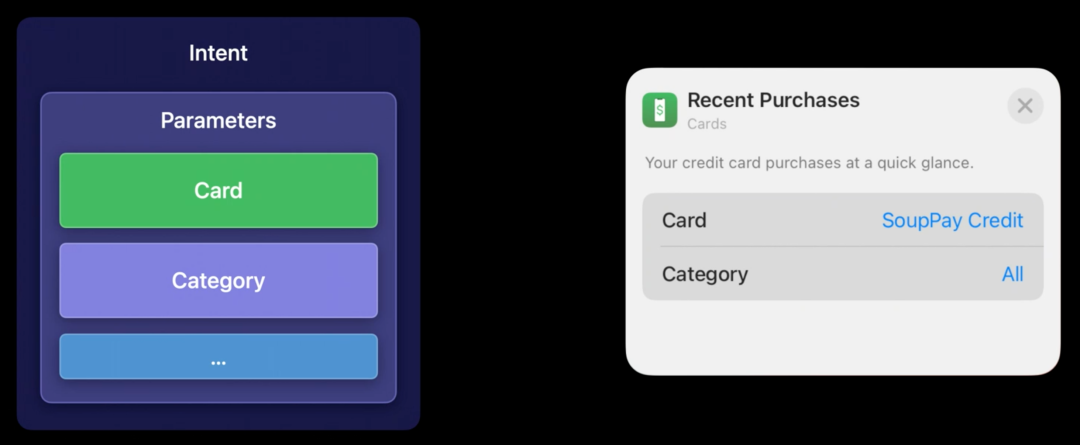为了让用户可以自定义 RecentPurchases Widget 所显示的信用卡账户、对应的消费分类的功能,我们可以定义一个包含了两个参数的 Intent: