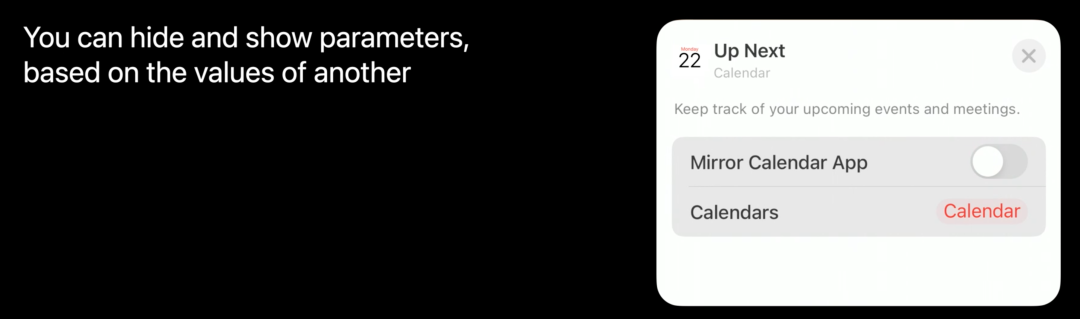 你可以控制某一个配置项,只在另一个配置项含有任何/特定值时展示。如下图,日历 App 的 Up Next Widget,仅在 Mirror Calendar App 选项没有被选中时,才会显示 Calendars 配置项。