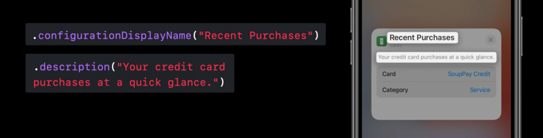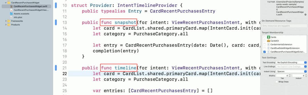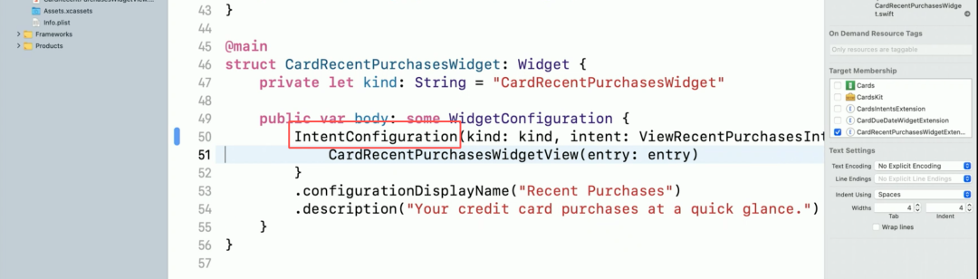现在我们定义了用于配置 RecentPurchases Widget 的 Intent 类型,同时实现了对应的 IntentHandling 协议。下面我们可以将 RecentPurchases Widget 切换至 Intent-based API 用以展示用户自定义的内容。