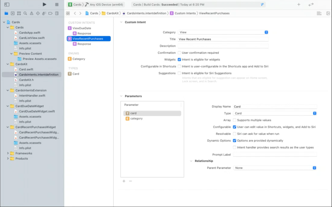 首先,我们在工程中的一个 Intent 定义文件中 (如项目中没有已有文件,可以通过 Choose File > New > File 选择 SiriKit Intent Definition File 添加)中,定义一个新的 Intent,叫做 ViewRecentPurchasesIntent。