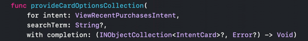 在打开该选项后,Xcode 会为生成的 IntentHandling 协议的 provideCardOptionsCollection(for:with:) 方法添加一个 searchTerm 参数: