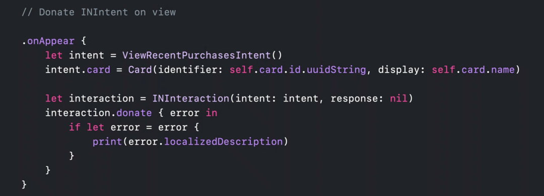 在宿主 App 内显示对应的信用卡消费记录时,创建并 donate一个ViewRecentPurchasesIntent。