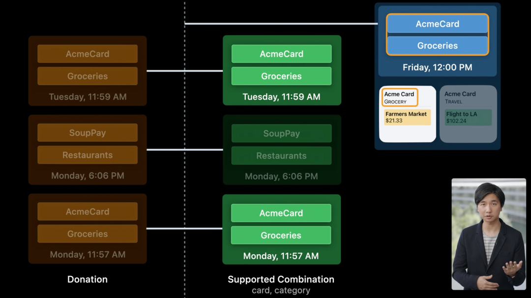 以前述的 RecentPurchases Widget 为例,我们希望系统能掌握用户查看特定信用卡消费记录的规律,并在合适的时机展示对应卡片的 Widget,下面进行逐步介绍: