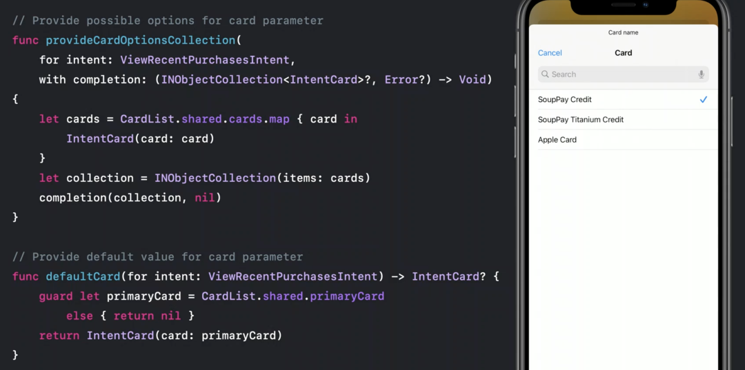 在示例应用中的 card 参数,用户添加了那些信用卡账号只有运行时才知道,对于那些需要在运行时确定有哪些待选项的参数,我们可以选中 Options are provided dynamically 选项,并实现对应的 IntentHandling 协议。