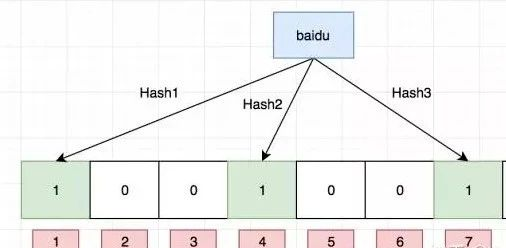 布隆过滤器是一个bit向量或者bit,如果我们要映射一个值到布隆过滤器中,我们使用多个不同的哈希函数生成多个哈希值,并将每个生成的哈希值指向的bit位设置为1,如下baidu一词设置了三个位置为1。