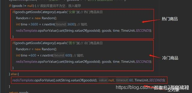 (1)采取不同分类商品,缓存不同周期。在同一分类中的商品,加上一个随机因子。这样能尽可能分散缓存过期时间,而且,热门类目的商品缓存时间长一些,冷门类目的商品缓存时间短一些,也能节省缓存服务的资源。