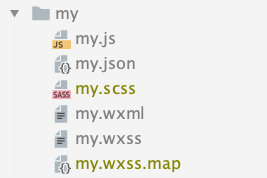 其中我们需要关注的就是 .js、.json、.scss、.wxml 文件,另外的文件 .wxss 会在你改动 .scss 文件之后自动生成并更新,而 .wxss.map 是插件自动生成的映射关系,不用管。
