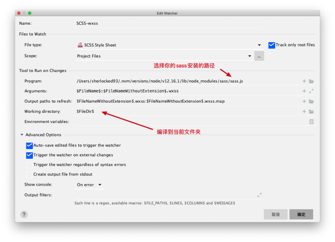 关于蹩脚的 .wxss 样式,我使用 webstorm 的 file watcher 工具把 scss 文件监听改动并实时编译成 .wxss 文件,感觉比较好用,这里给大家分享一下我的配置:
