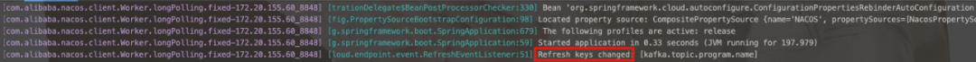 spring.cloud.nacos.config.ext-config[0].refresh=true该参数表示是否开启自动更新,根据是否需要自动更新觉得是否配置,如果需要自动更新,加上这个配置后还需要在需要自动更新配置的 Bean 上面增加@RefreshScop注解。然后对应的 Bean 内部的属性就可以实现自动更新了。增加了spring.cloud.nacos.config.ext-config[0].refresh=true配置后在修改了 Nacos 中的配置过后日志会出现下面信息,会重新加载配置,并且输出变更的 key 信息。