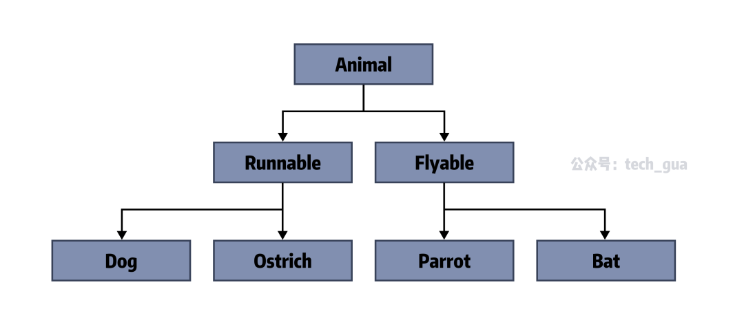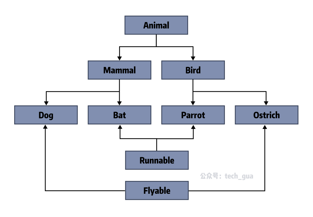 现在,我们给动物加上加上 Runnable 和 Flyable 的功能,当我们定义好这两个描述能力的类,使用多继承来描述每个动物即可: