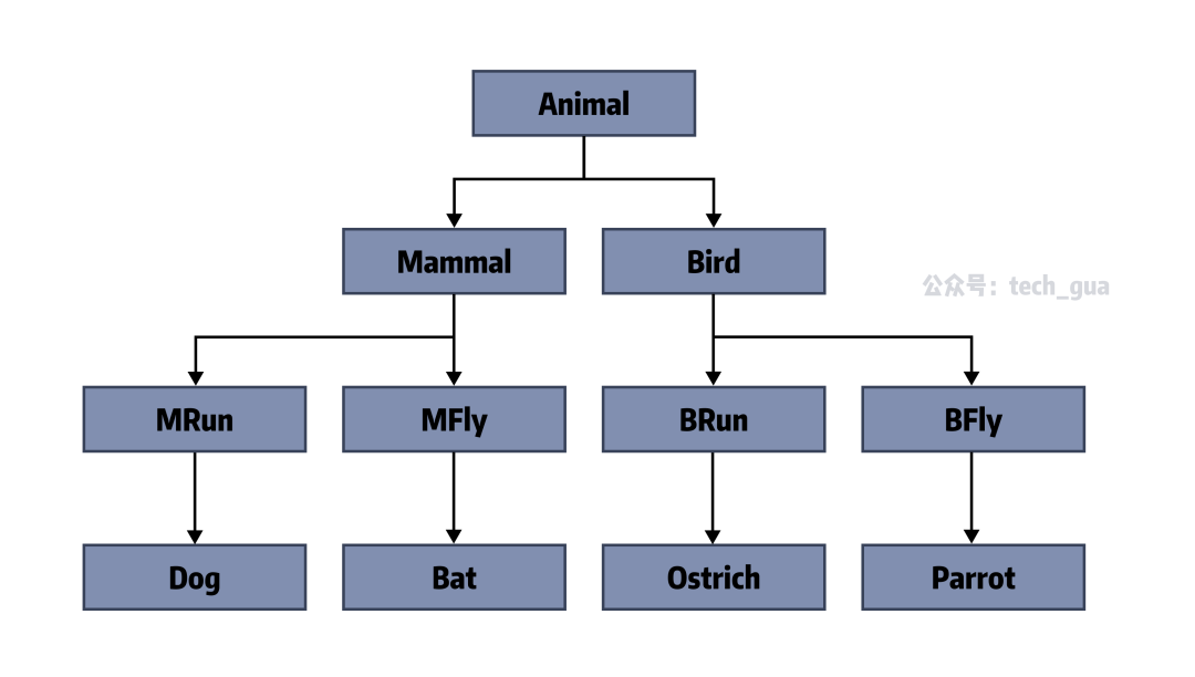 但是在我们的代码中又想拥有之前哺乳动物和鸟类动物也增加进来,那么我们就要设计更加复杂的层次: