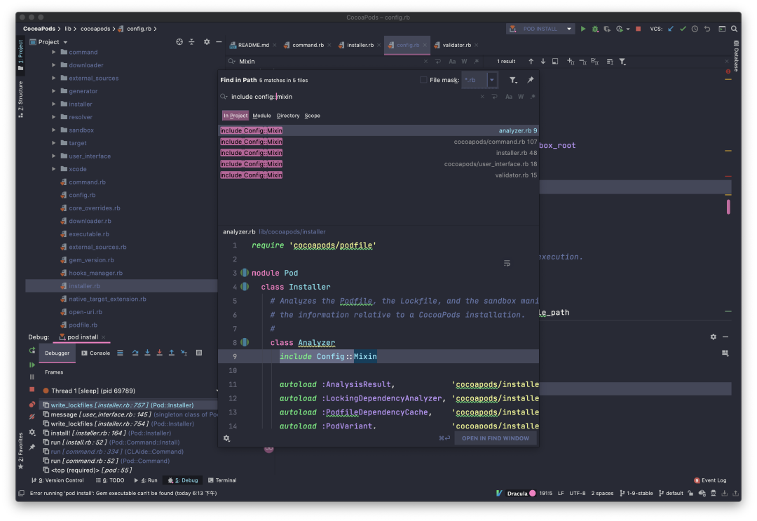 我们可以看到 Installer 拿入了 Config::Mixin 这个 module。而这个 config 属性其实就是 CocoaPods 中的一些全局配置变量和一些配置字段。