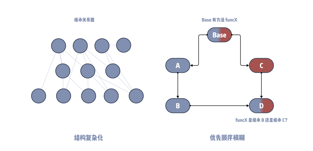 优先顺序模糊 - 假如有 A、C 同时继承了基类,B 继承了 A,然后 D 又同时继承了 B 和 C,所以此时 D 继承父类方法的顺序应该是 D ⇒ B ⇒ A ⇒ C 还是 D ⇒ B ⇒ C ⇒ A?又或者是其他顺序?如此优先顺序十分模糊。 -